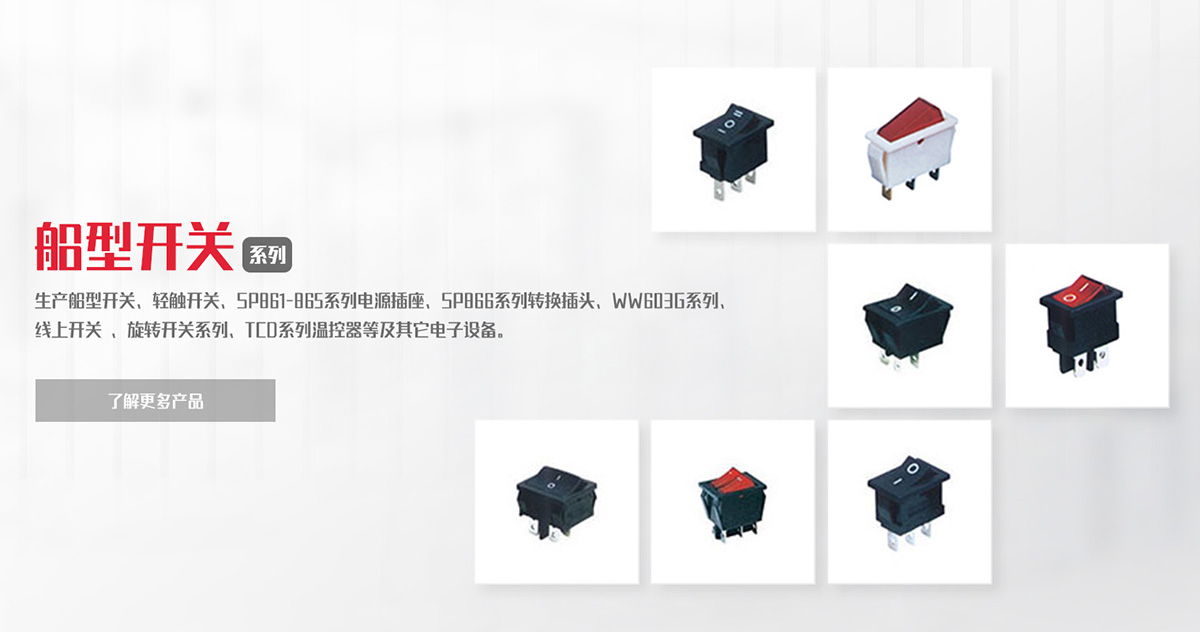 公司專業(yè)生產船型開關、輕觸開關、SP861-865系列電源插座、SP866系列轉換插頭、WW11系列微動開關、WW01-03、09系列按鈕開關DS、WW系列指示燈開關、WW603G系列 線上開關 、旋轉開關系列、TCD系列溫控器等及其它電子設備。
